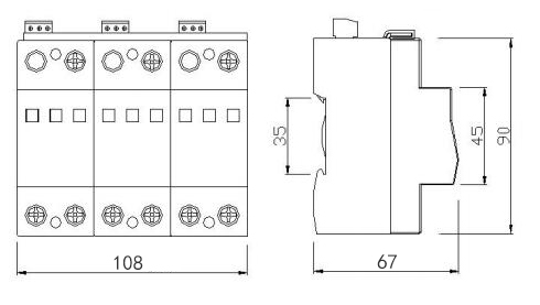 產(chǎn)品采用 35mm 標(biāo)準(zhǔn)導(dǎo)軌安裝,單模尺寸為:90×67×108(mm),未標(biāo)注公差:±1mm。如下列圖所示(單位:mm):